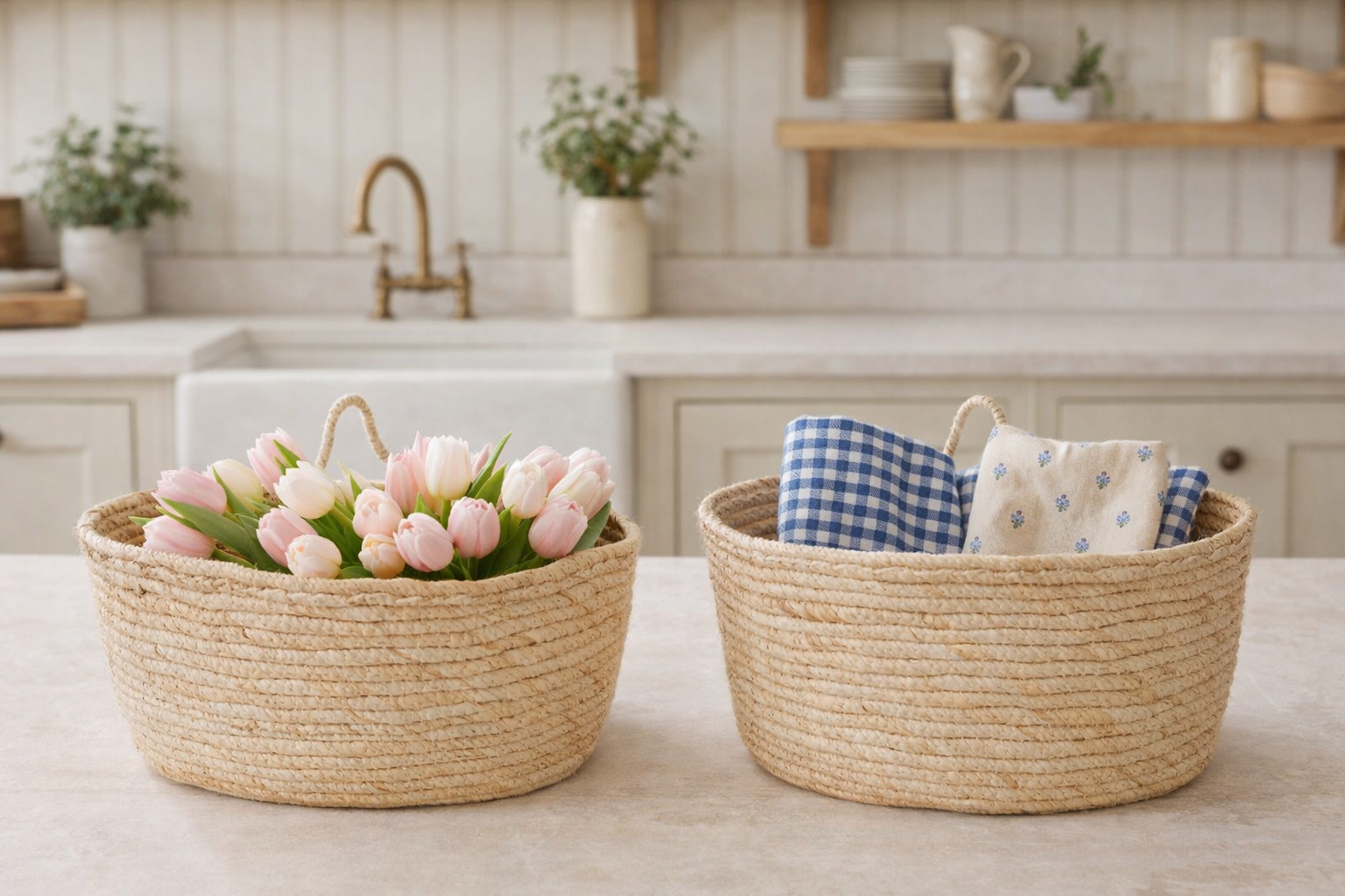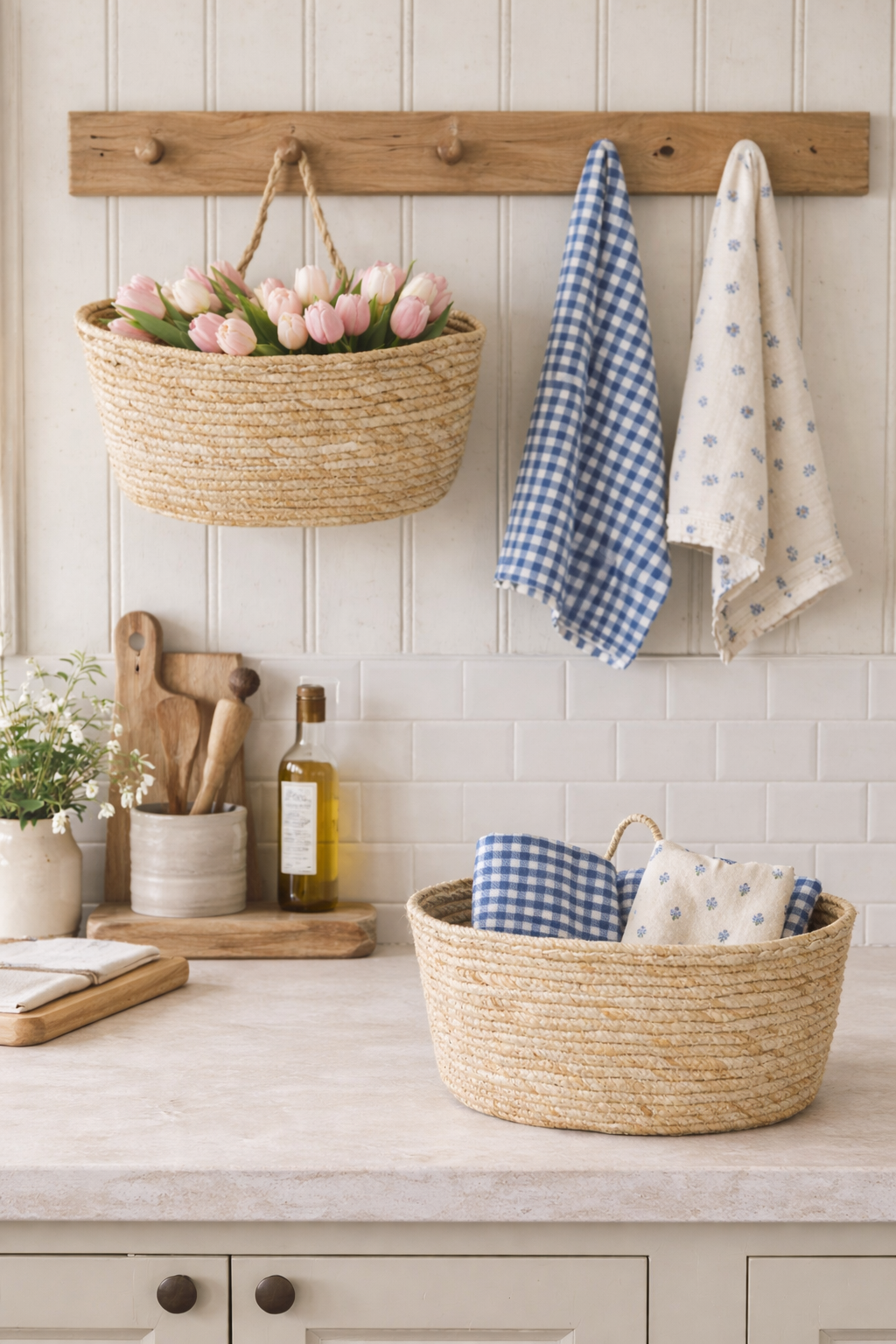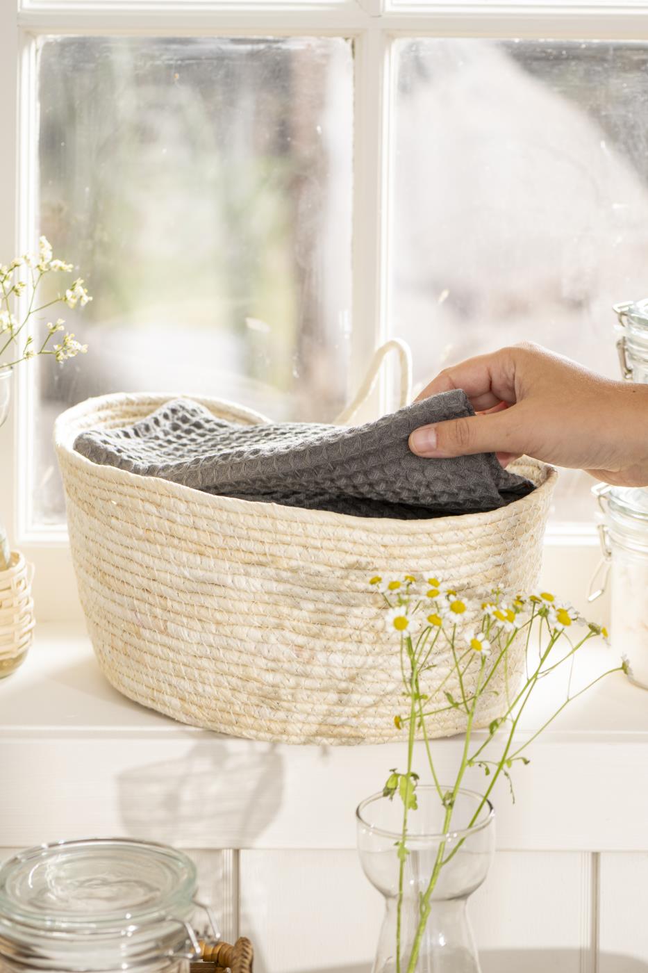 Coppia di cestini in fibra naturale di mais, perfetti per organizzare gli spazi con eleganza. Il set comprende due misure complementari: il grande (31x19x22 cm) e il medio (28x17x19 cm), entrambi dotati di pratico manico. Versatili e raffinati, si adattano a cucina, bagno, veranda, terrazzo e ingresso. Ideali sia da appoggiare su superfici che da appendere, trasformano l'ordine in un elemento decorativo di charme naturale.
