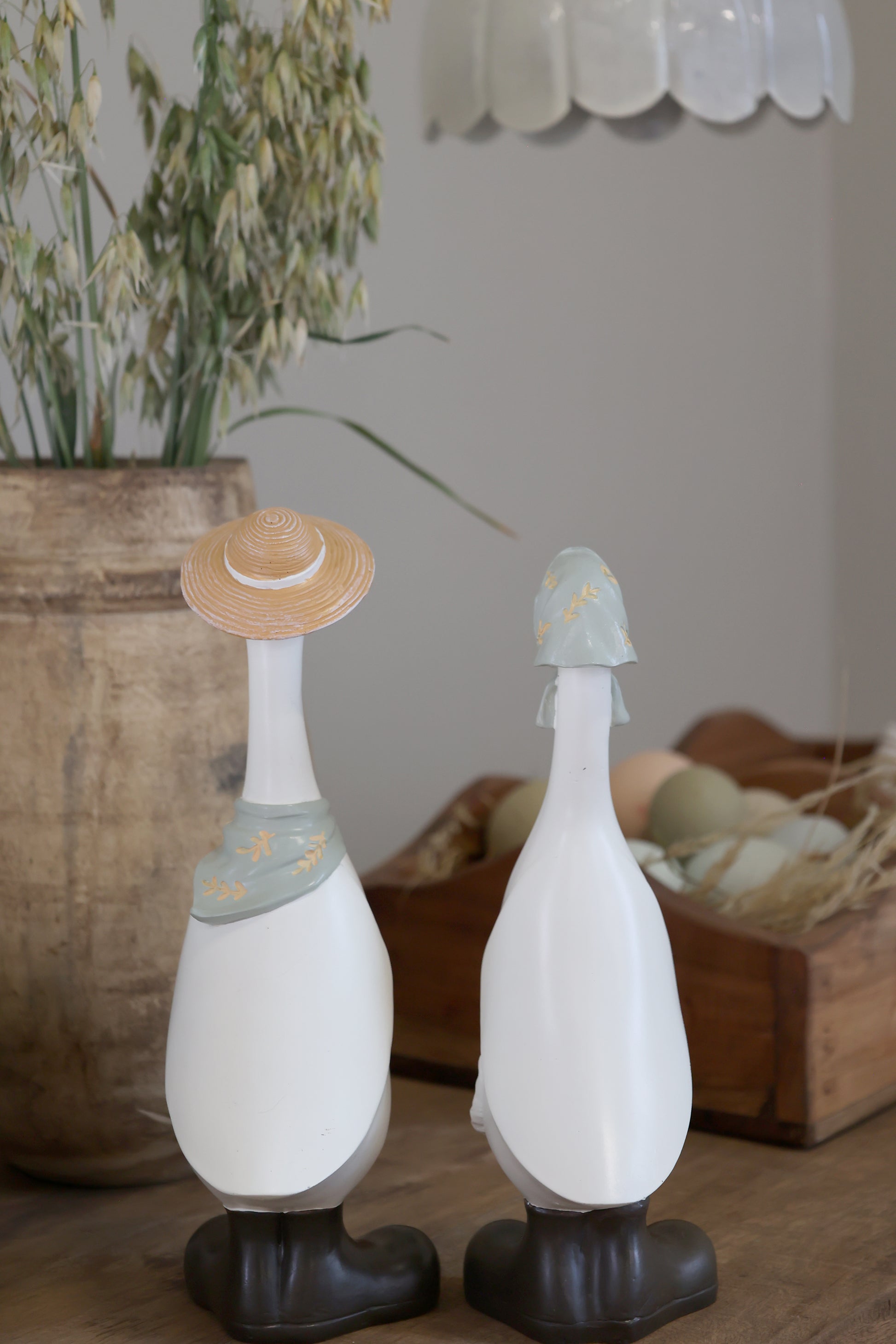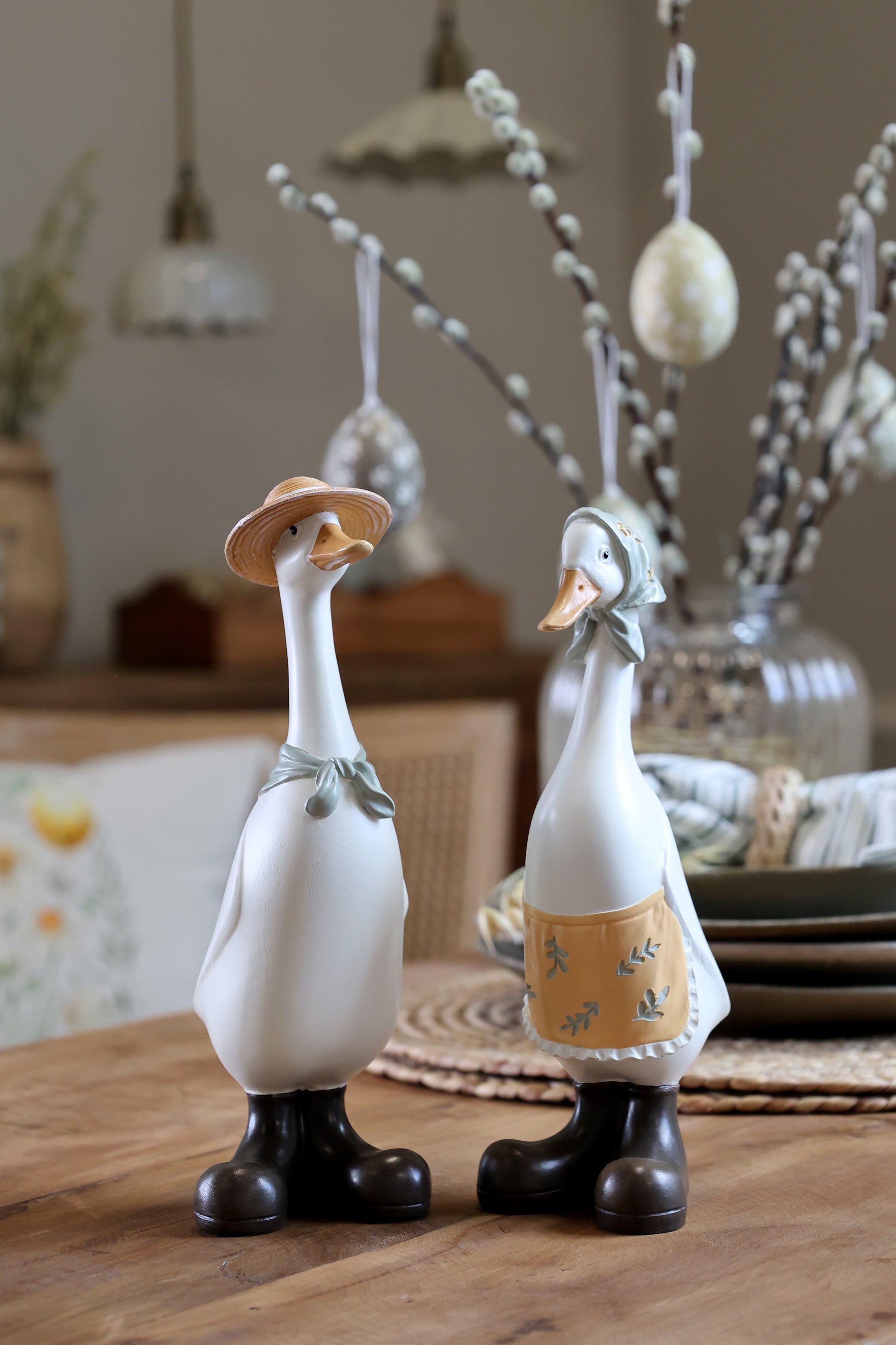 Adorabili ochette in due varianti, perfette per decorare la casa con uno stile primaverile e pasquale. Con le loro dimensioni (h 23 x 8 x 9,5 cm), si posizionano facilmente su mensole, tavoli e angoli della casa. Ideali per creare un'atmosfera festosa e accogliente durante la stagione pasquale, aggiungono un tocco di simpatia e colore a qualsiasi ambiente. Una scelta delicata per chi ama i dettagli decorativi che raccontano la bellezza della primavera.