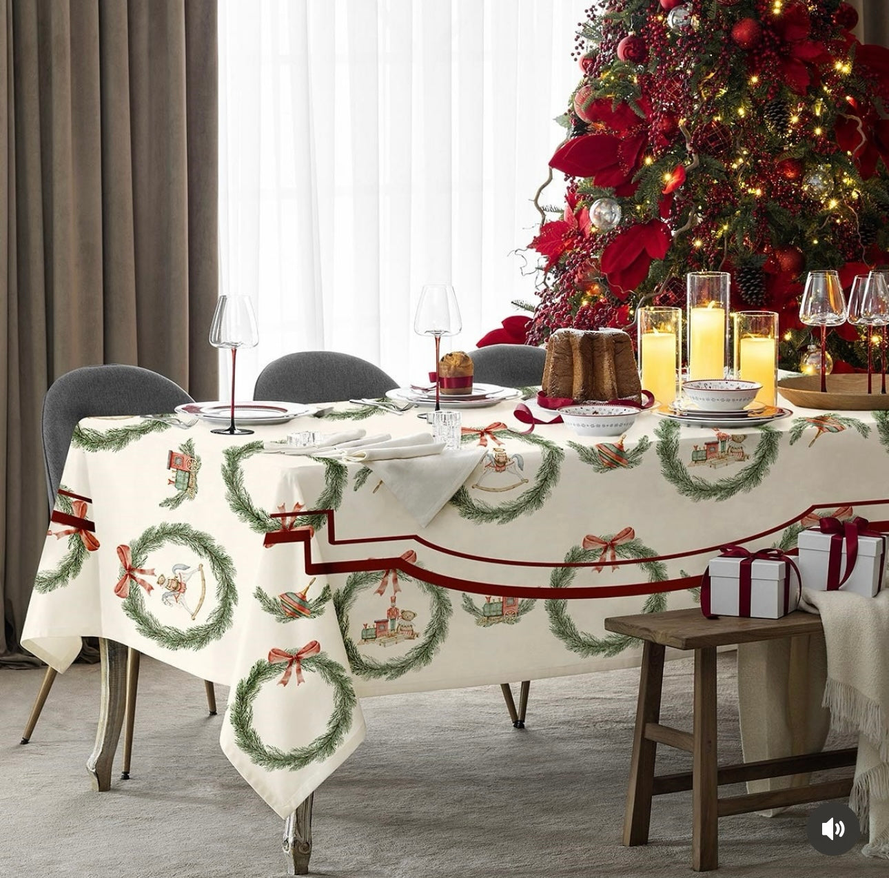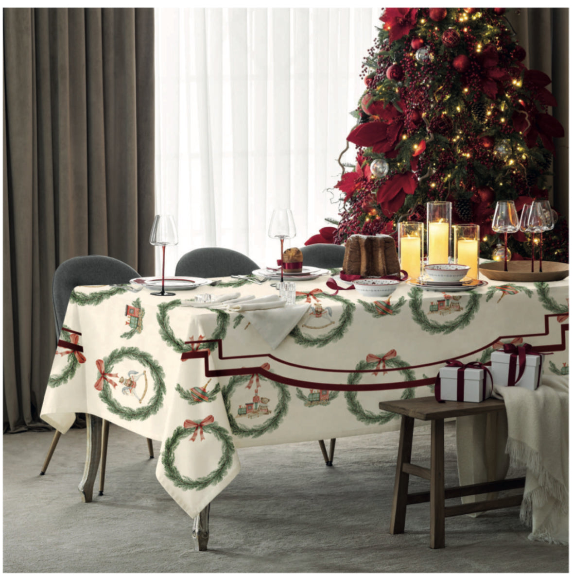 Questa elegante tovaglia natalizia incanta con una raffinata decorazione di ghirlande verdi, arricchite da delicati fiocchi, orsacchiotti e cavalli a dondolo. Disponibile in due dimensioni (155x180 cm e 155x250 cm), è la scelta perfetta per impreziosire la tavola durante le festività, creando un’atmosfera calda e accogliente con un tocco di sofisticata tradizione.